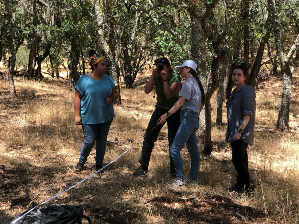 (Pictured above) Fire Forward Logistics Manager Hannah Lopez shows research assistants Kylie Diaz, Rachel Garcia and Breanna Johnson how to estimate hill slope using a compass.
