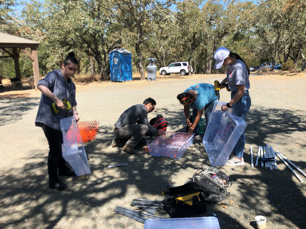 (Pictured above) Research assistants and Professor Marks-Block construct acorn traps that will be used on some of the plots. The netting allows acorns to fall through but deters other critters from gathering the study samples.