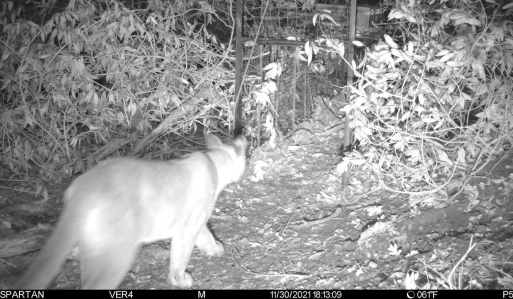 Above: Mountain lion P12 approaches a walk-through trap in late November, 2021