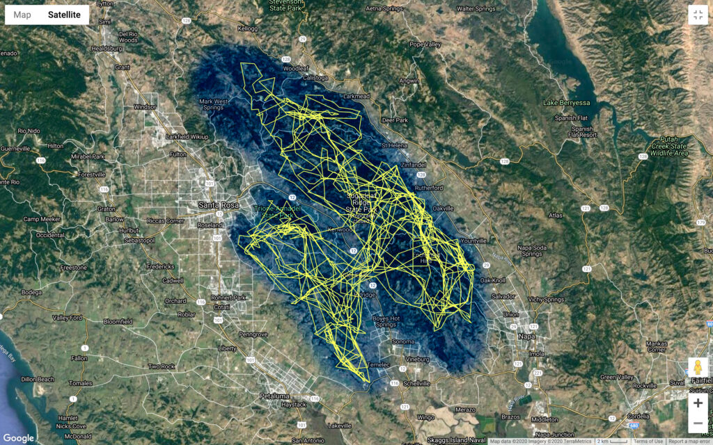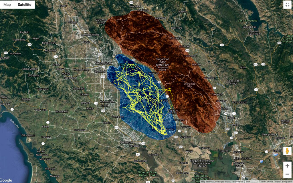 Luna is either the daughter of P4 or P10, older adult females we have tracked and collared in the Mayacamas Mountains. Results from our preliminary genetic work show that till recently, P5 has been the father of all documented kittens born in the southern part of the study extending from Santa Rosa south beyond Sonoma. When we started tracking P5 in April 2017, he had a large range of roughly 250 sq. miles—from Mark West Springs to Sonoma then west over Hwy 12 with Hwy 101 as his western boundary and Hwy 29 as his eastern boundary. He was the sole adult male in the area.