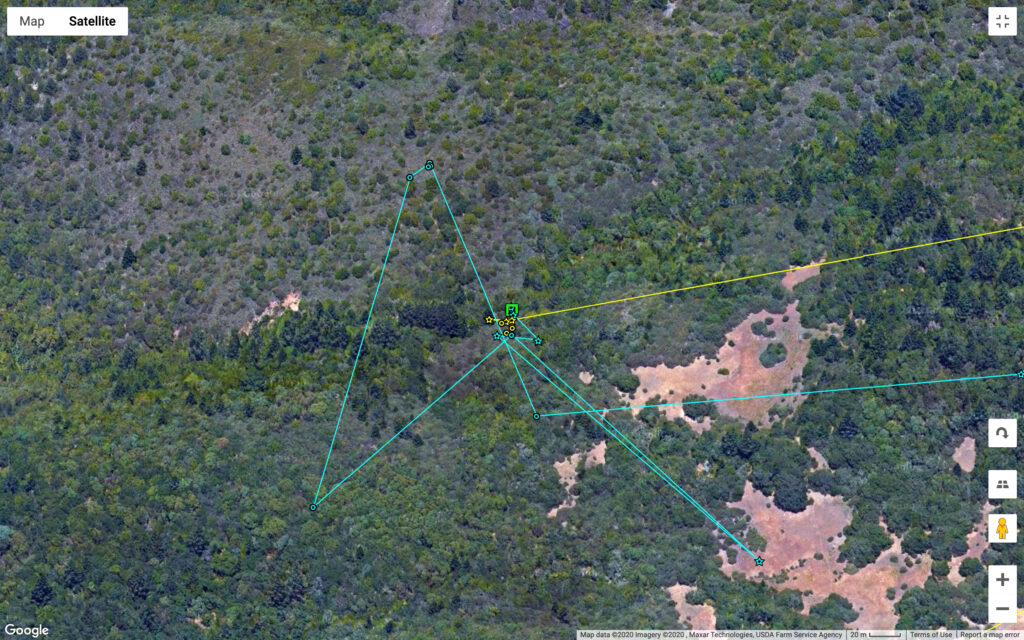 At 9pm on April 22, Luna had guided the kittens to a dense, overgrown, dry drainage on Bouverie Preserve. She then left the kittens in a dense re-sprouting bay tree at after 11pm to go hunting, returning at 3pm the following day. On the 23rd P5 crossed Highway 12 again, but this time he happened to come across Luna and the kittens at midnight the same day. Early on the 24th, Dr. Quinton Martins downloaded the lion data to find the overlap of GPS points between Luna and P5 from that morning. Quinton hiked out to the area with the grim prospects of what he might find. In the thicket located by the GPS points, he found the remains of both kittens—all consumed but for the jaw bones and tail. P5 may have heard the kittens, been attracted to this dense bush, and then killed them on site knowing that the cubs were not his own.
