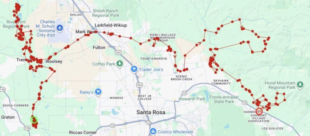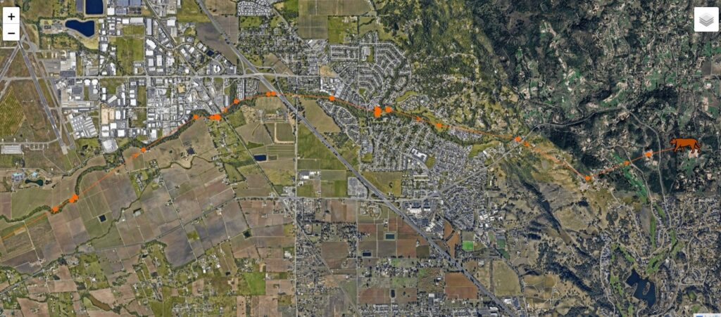 In the GPS tracking of P51, his bold trajectory revealed the crossing of country roads, traveling beneath a bridge on Highway 101, and moving through an urban area of Santa Rosa. With sufficient forest and brush as cover, he was able to make a 49-day journey from west Sonoma County, near Graton, to the Mayacamas Mountains and south to Sonoma Valley.