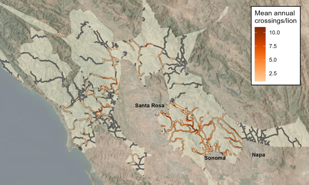 Along Highway 12, Jennings found hotspots that weren’t identified in previous connectivity plans. The study also pointed to sections of Arnold Drive in Glen Ellen, which runs parallel to Highway 12. These sections seem to be important for mountain lions where connectivity across Sonoma Valley may be limited.