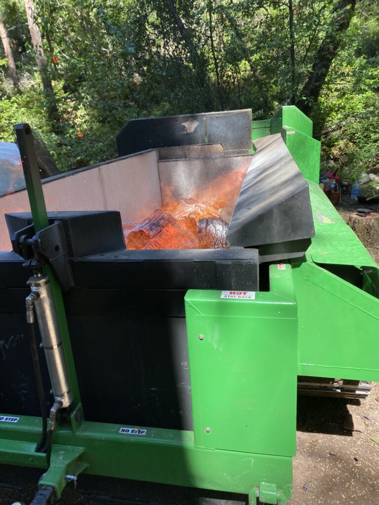 Air curtain burner at Bouverie Preserve. Once fuels are ignited in the box, an air “curtain” is blown across the top (from right to left, at a diagonal-down angle) to recirculate embers, smoke, and heat back into the box. Afterward, just a small pile of ash remains.