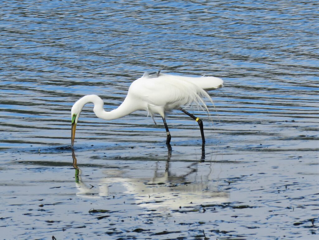 Between 2017 and 2019, we placed small GPS backpacks on egrets to measure whether they chose natural wetlands more often than shellfish areas to forage for their diet of fish and aquatic invertebrates.