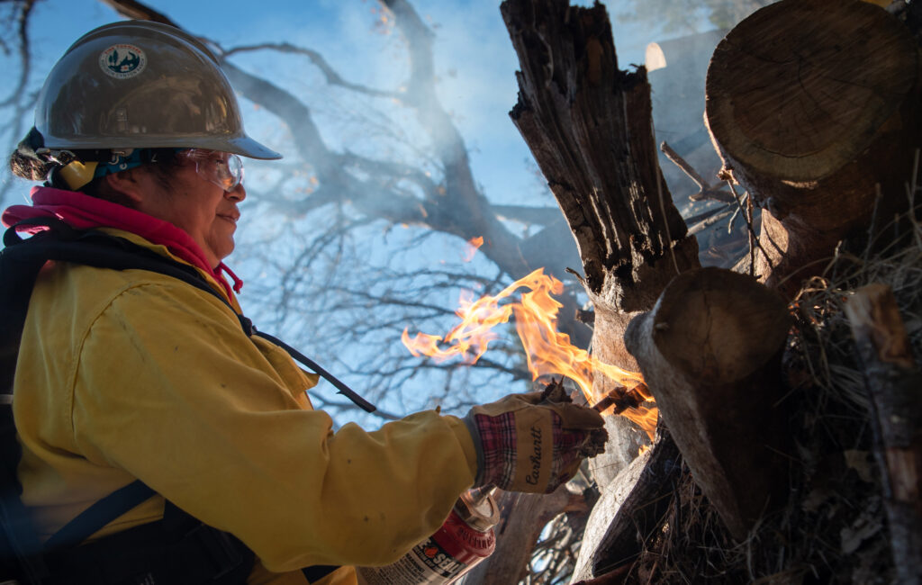 Maria Salinas uses a drip torch to ignite a burn pile. Photo by Brooke Anderson. Originally published in Yes!
