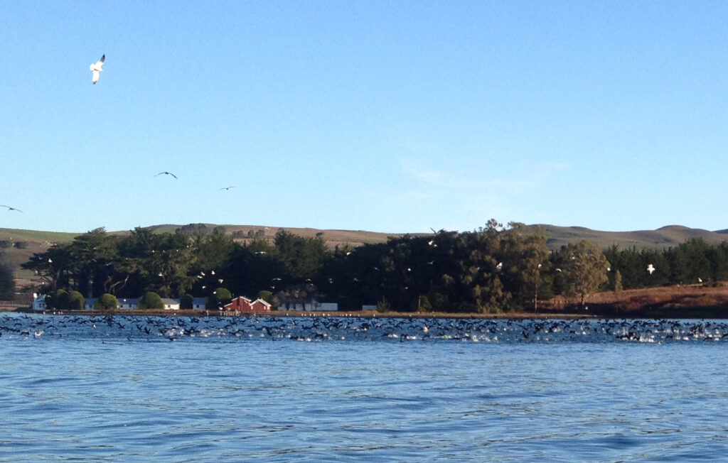 Waterbirds foraging on Pacific herring near All Hands Ecology’s Cypress Grove Research Center on Tomales Bay.