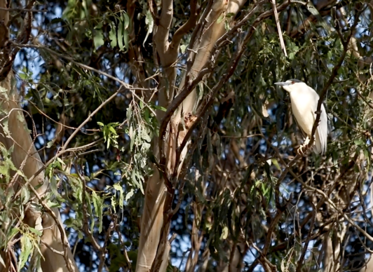 Black-crowned Night Heron in eucalyptus trees of the heronry.