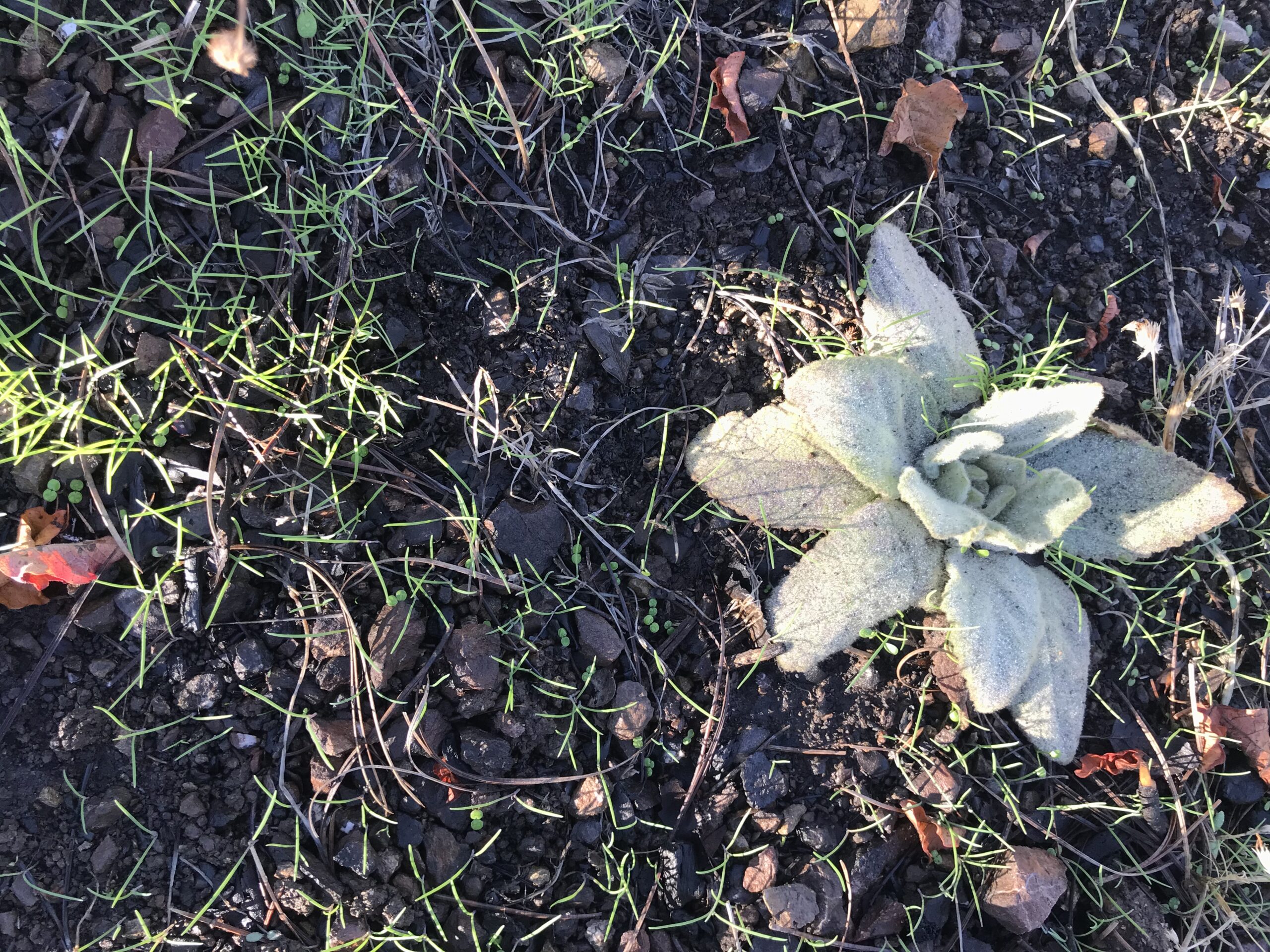 On the Modini Preserve in the northern Mayacamas Mountains, new post-fire populations of the non-native, woolly mullein (Verbascum thapsus) have exploded in several areas of burned knobcone pine (Pinus attenuata) understory—areas that were dominated by native species last spring.