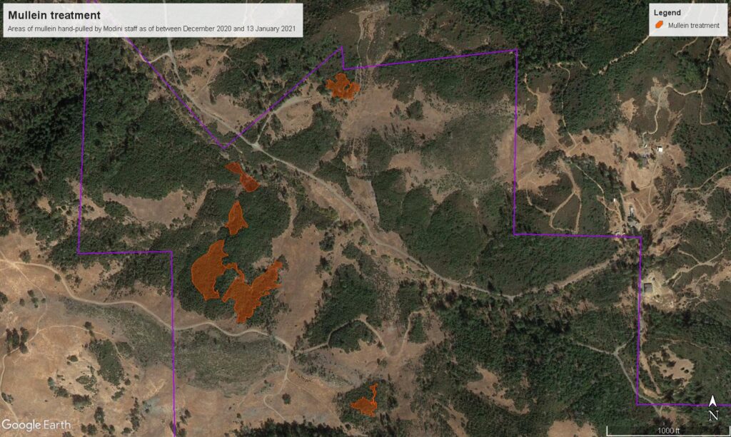 Close up of mullein treatment area targeted by preserve staff between December 2020 and early January 2021.