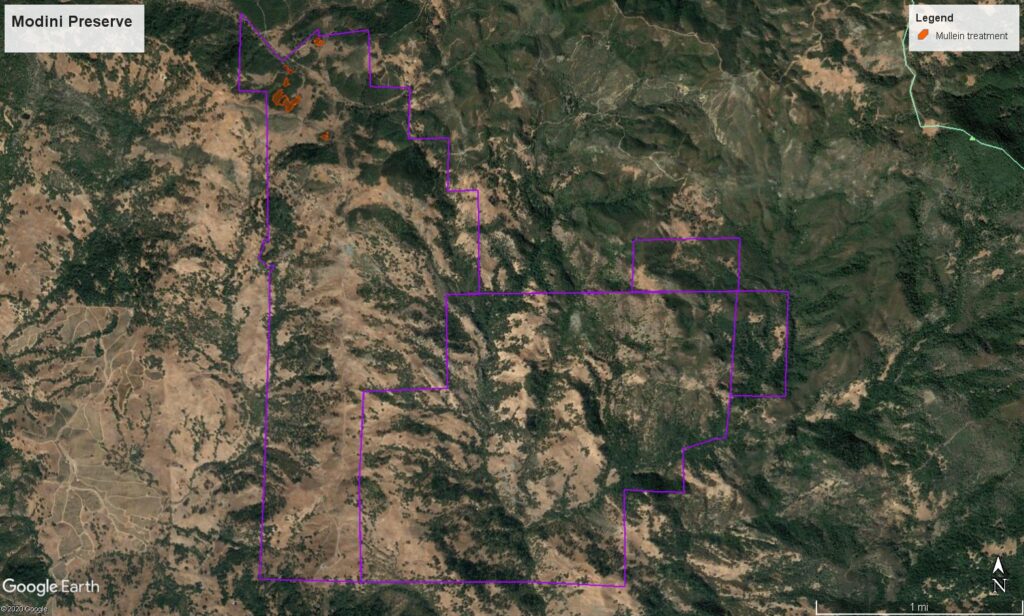 Native to Eurasia, woolly mullein was intentionally introduced to the U.S. many times due to the plant’s medicinal qualities. It relies on periodic disturbance for seedling establishment, which is greatly enhanced when there is bare ground—taking full advantage of conditions in play on the Preserve after the 2019 Kincade fire.